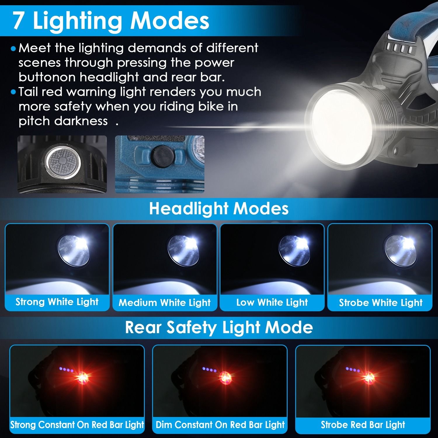 *7 Lighting Modes*:Press the power button on headlight and power button on the safety bar; 7 lighting modes will meet your different scenarios.(Strong White Light;Medium White Light;Low White Light;Strobe White Light;Strong Constant On Red Bar Light; Dim Constant On Red Bar Light;Strobe Red Bar Light).