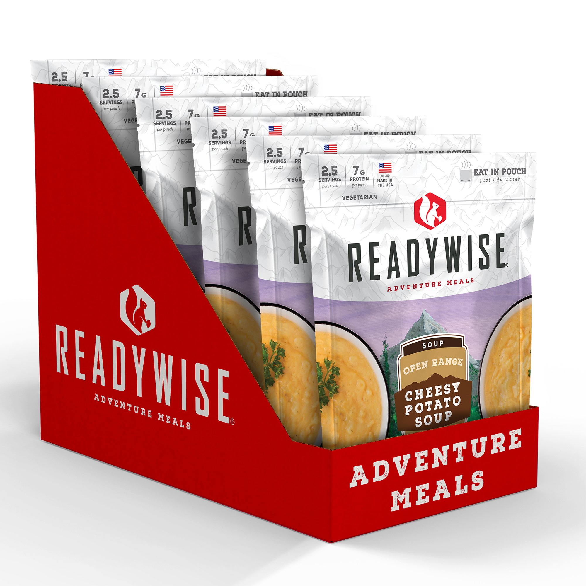 Each pouch of Open Range Cheesy Potato Soup contains 2.5 servings and is resealable. These pouches are lightweight making the easily portable for any outdoor adventure. Just add water and you can eat directly from the pouch.
