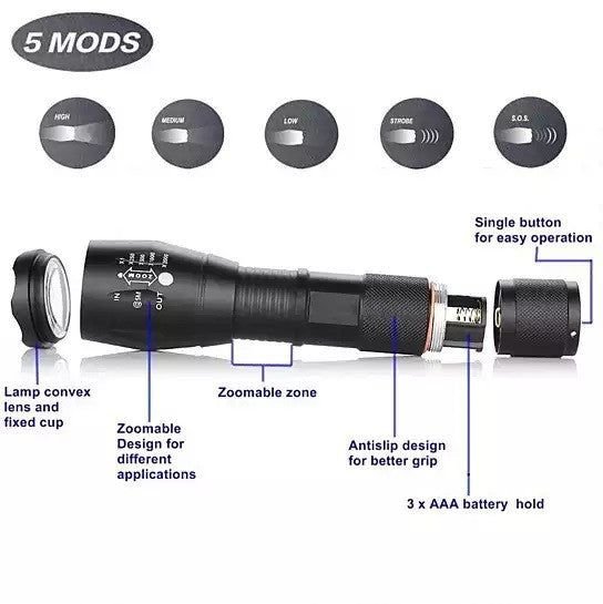 Zoom in a Flash this all metal body zoomable flashlight is made of light weight aero grade aluminum that will take the hard knocks and sudden drops and still light up.   The zoomable flash light is perfect for camping; Outdoors; Around the home; for your Glove Compartment in the Car or for all emergency it allows you to zoom into the subject you are trying to watch from far away distance and can work at safe distance and still be able to view everything.